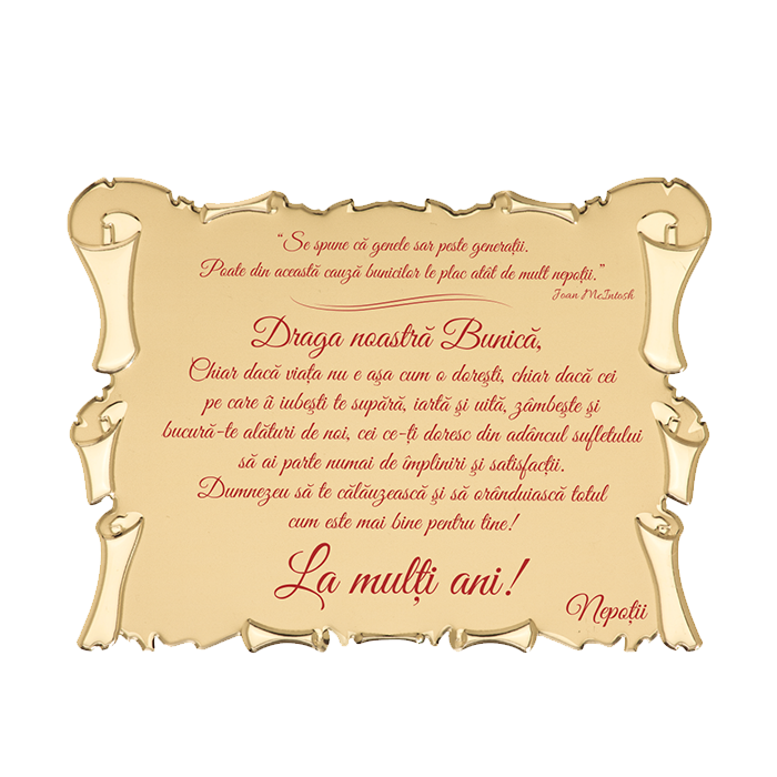 Cutie de plus cu dimensiunea – 26/21 cm  Placheta metalica din interior este de 20/15 cm. Scrie in casuta de mai sus mesajul care doresti sa fie pe placheta metalica sau doar completarea la textul model. Nu se percep costuri suplimentare. In limita stocului disponibil, onoram orice comanda in termen de 1-2 zile (livrare prin curier). Imaginea are caracter informativ si pot exista mici diferente in functie de model.