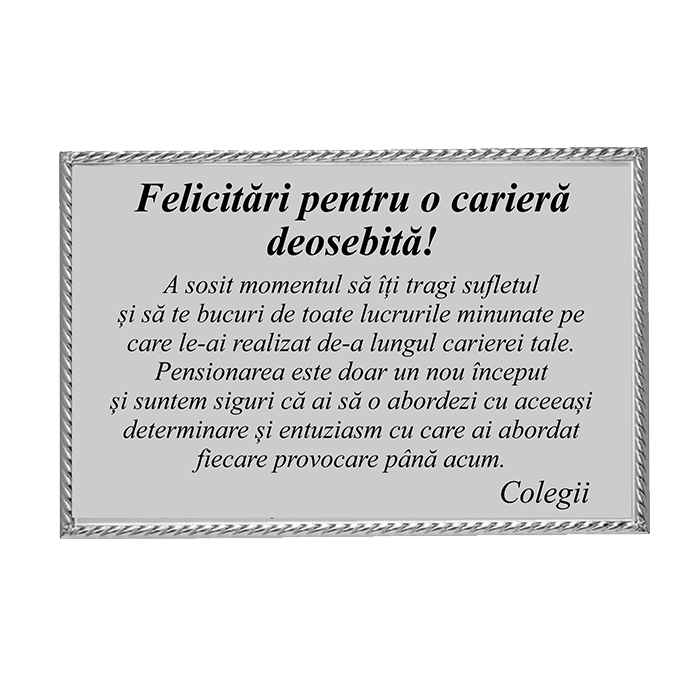 Trofeu de pensionare compus din placheta metalica si figurina plastic. Dimensiuni suport 18/13cm. Placheta metalica este de 15/10 cm iar figurina 18 cm inaltime. Scrie in casuta de mai sus mesajul care doresti sa fie pe placheta metalica sau doar completarea la textul model. Nu se percep costuri suplimentare. In limita stocului disponibil, onoram orice comanda in termen de 1-2 zile (livrare prin curier). Imaginea are caracter informativ si pot exista mici diferente in functie de model.